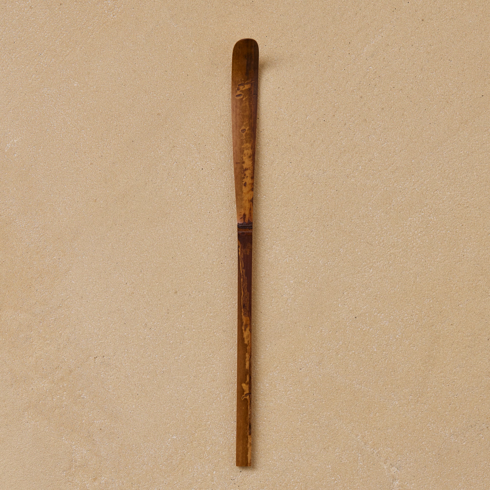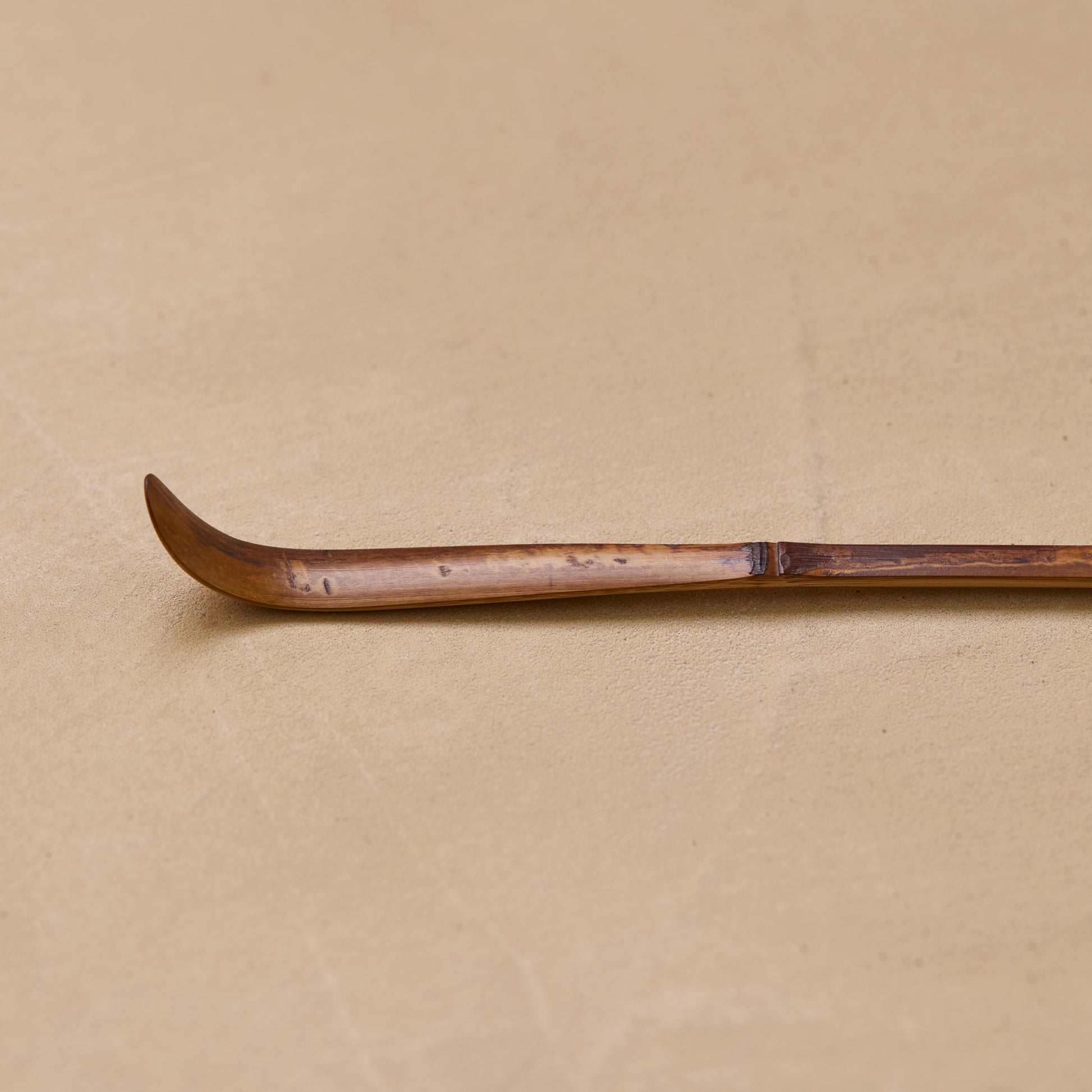 現在、良質な煤竹は希少傾向にあります。竹工芸家・初田徹は、そのような限りのある素材と丁寧に対話をしながら、吟味した竹をひとつひとつ削ります。煤竹が織りなす独特の色味と艶、美しく湾曲した櫂先、そして使用に差し支えない古い傷跡は見所として、用と美を兼ね備えた作品です。