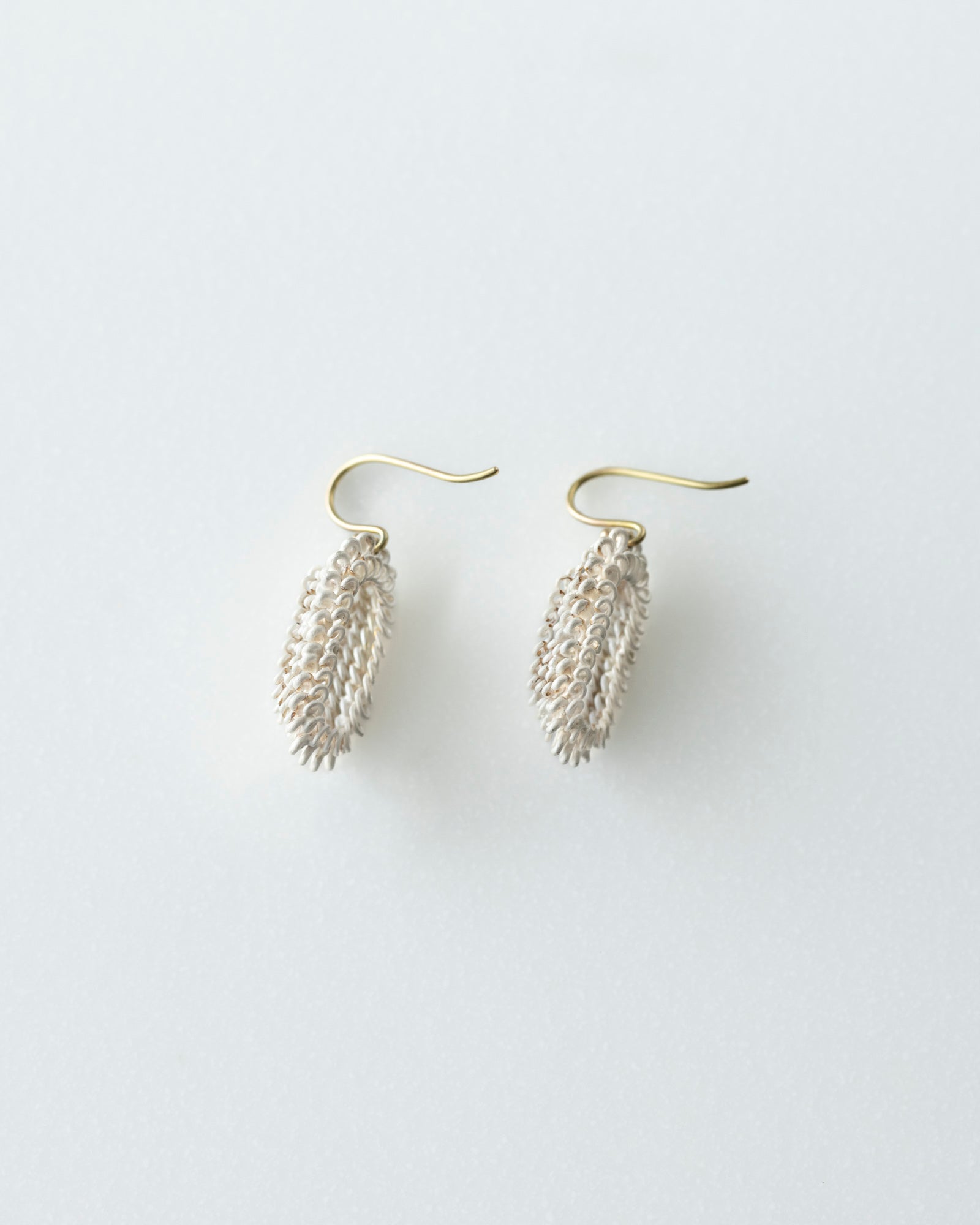 These stud earrings feature what the designer was drawn to, such as swirls, knots, and buds. The soft texture of the designs creates gentle shadows that move with the movement of the ear.