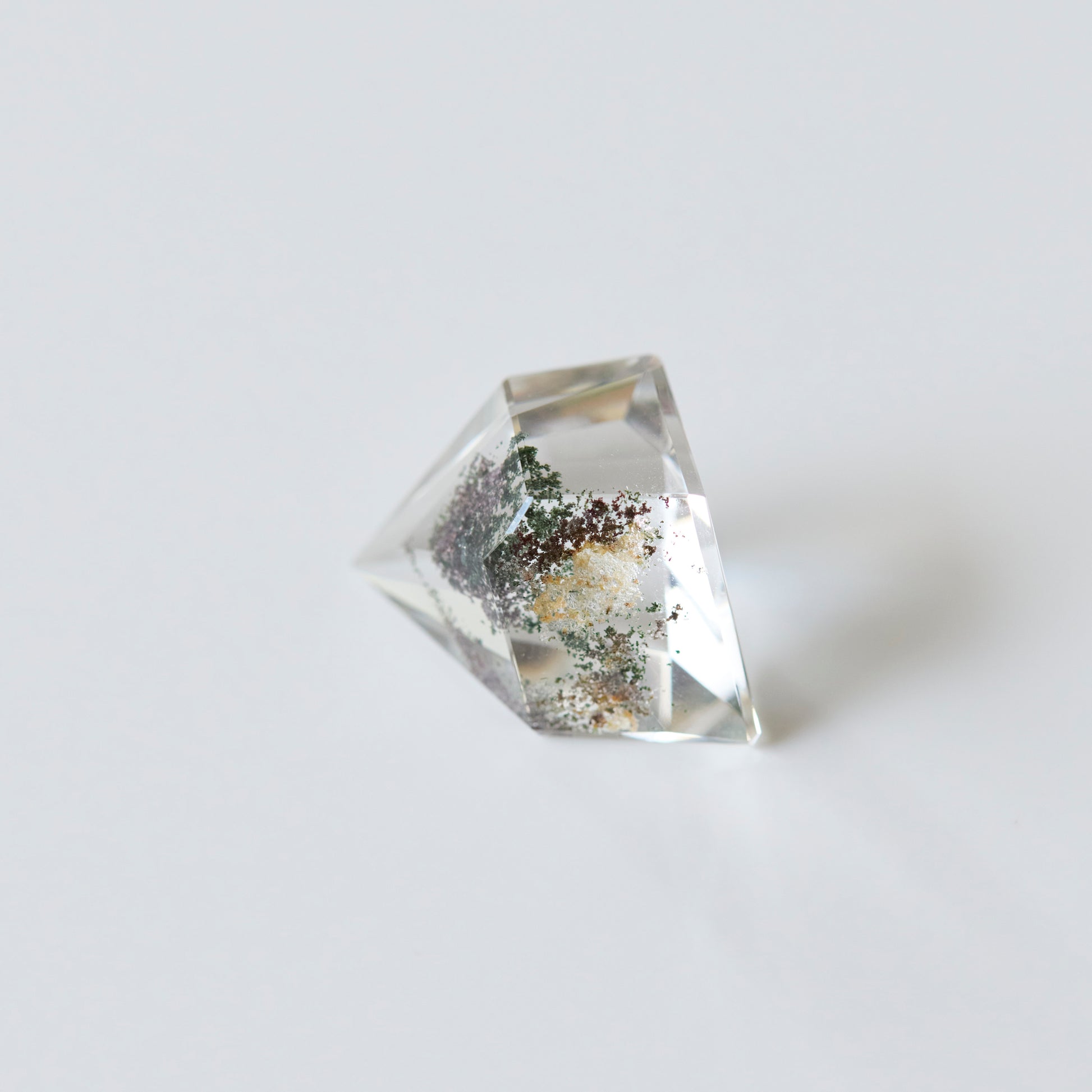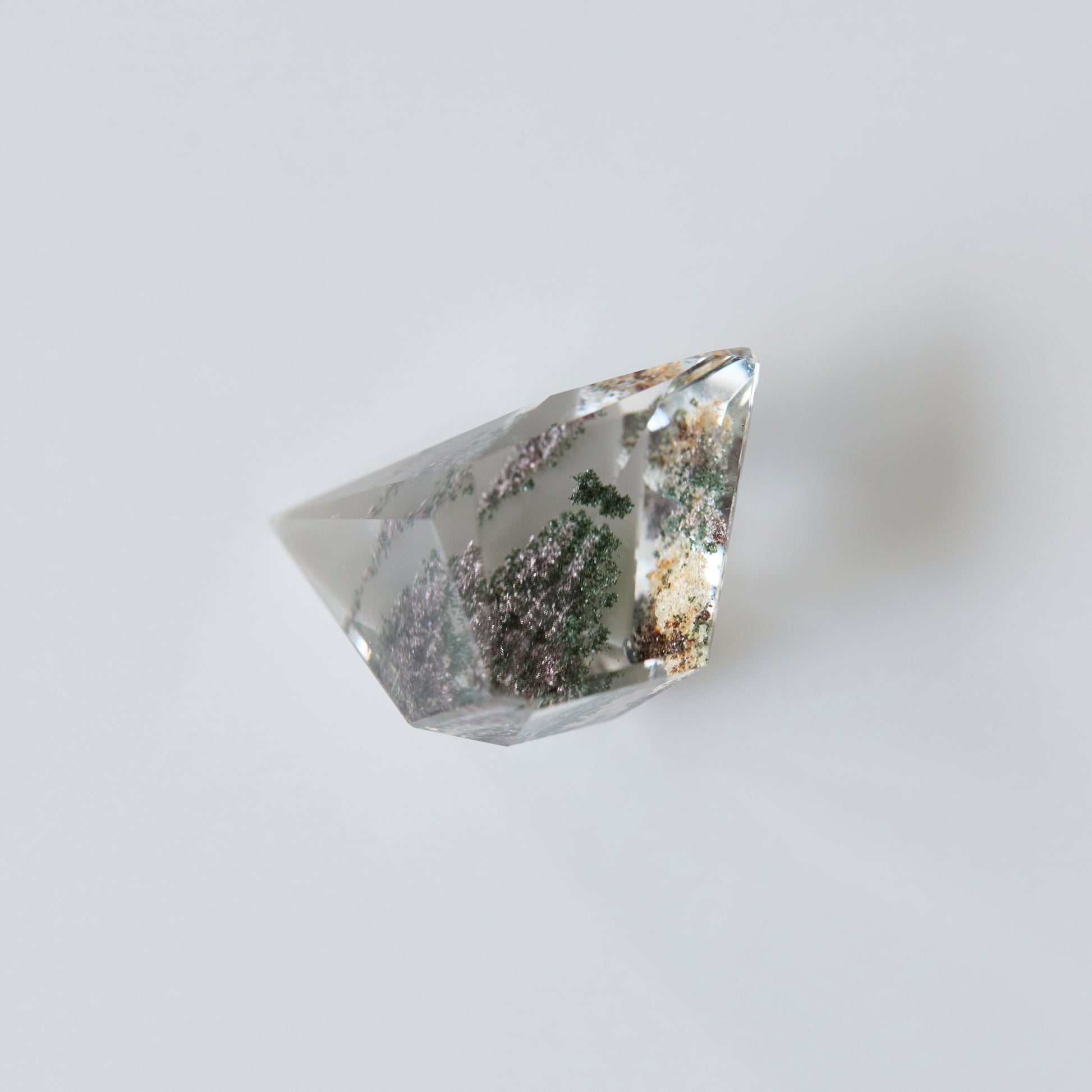 Garden quartz is a transparent quartz crystal that contains minerals such as chlorite, making it look as if a landscape painting has been trapped inside the crystal. The inclusions create patterns reminiscent of green moss and ferns, as well as the outlines of mountains and clouds, making it look like a small garden has been trapped inside.