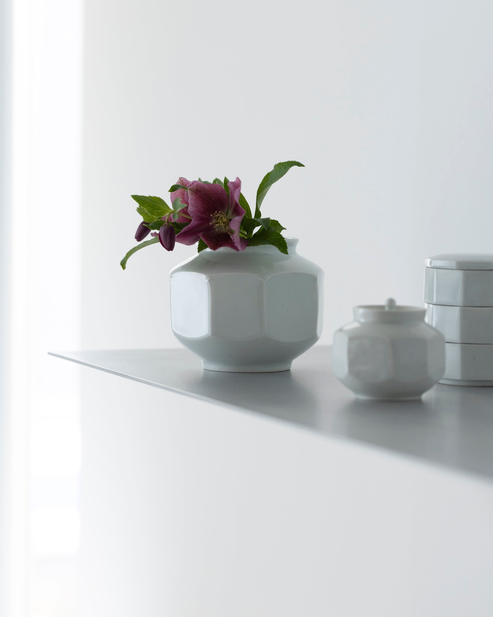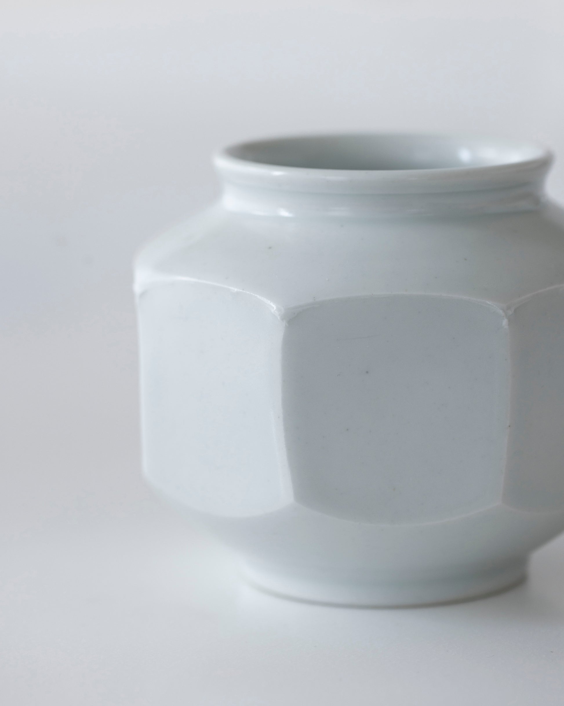 こちらの八角壺は、シャープな輪郭が際立つ凛とした佇まいが印象的。オブジェとしてはもちろん、野花や枝ものを一枝いけると、淡く青みを帯びた雪の白やかたちの美しさがいっそう引き立ちます。