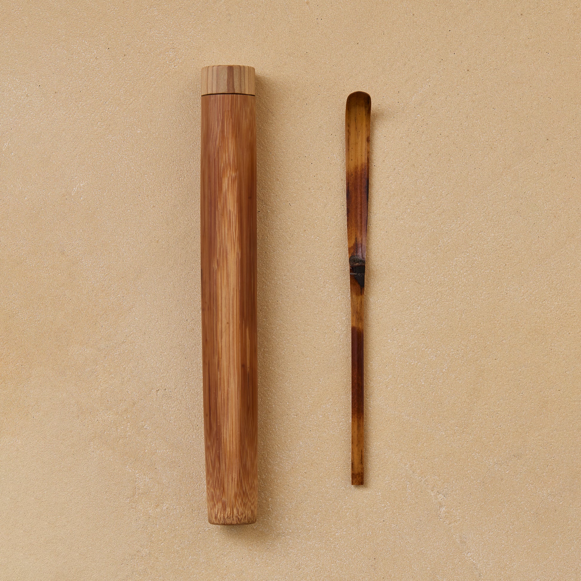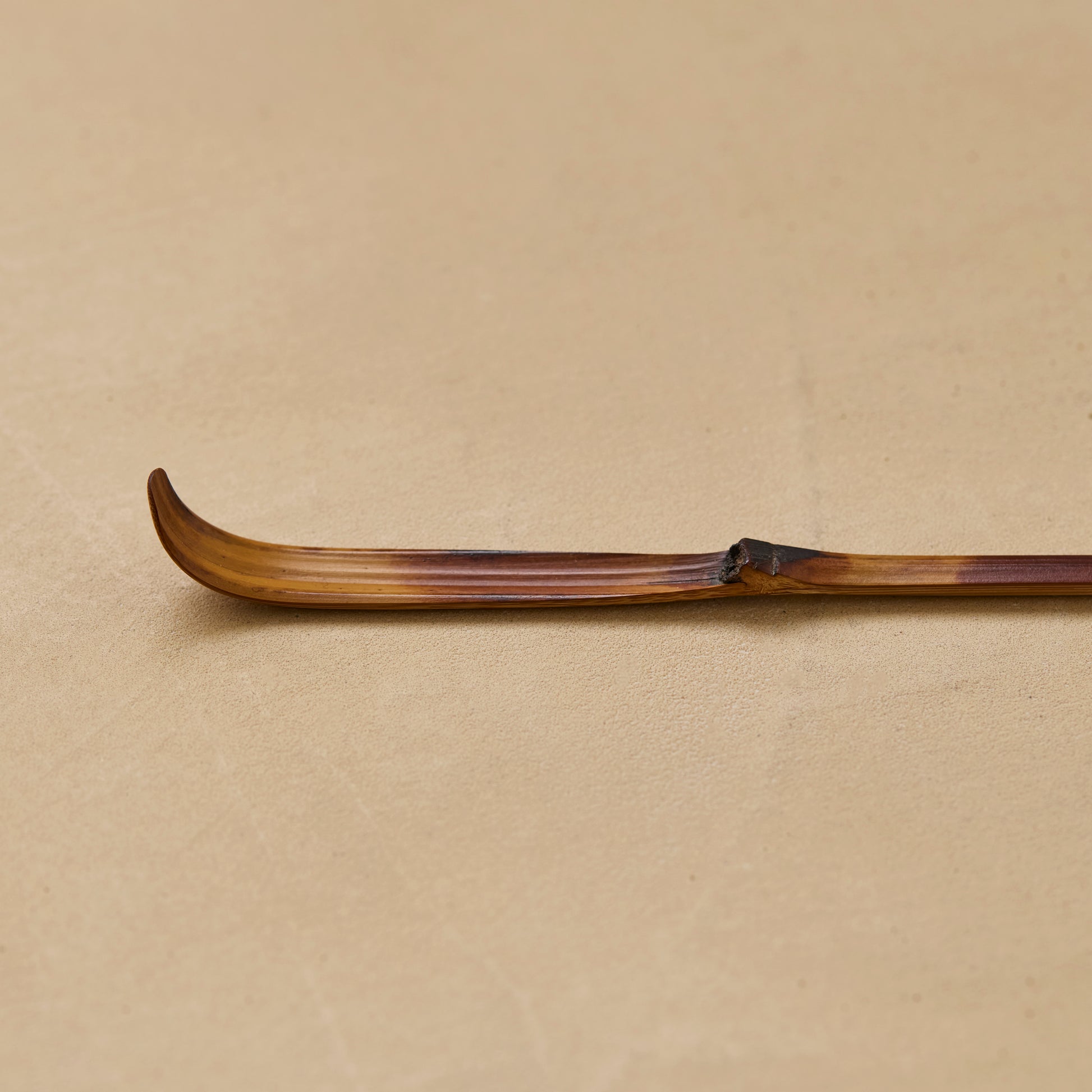 現在、良質な煤竹は希少傾向にあります。竹工芸家・初田徹は、そのような限りのある素材と丁寧に対話をしながら、吟味した竹をひとつひとつ削ります。煤竹が織りなす独特の色味と艶、美しく湾曲した櫂先、そして使用に差し支えない古い傷跡は見所として、用と美を兼ね備えた作品です。