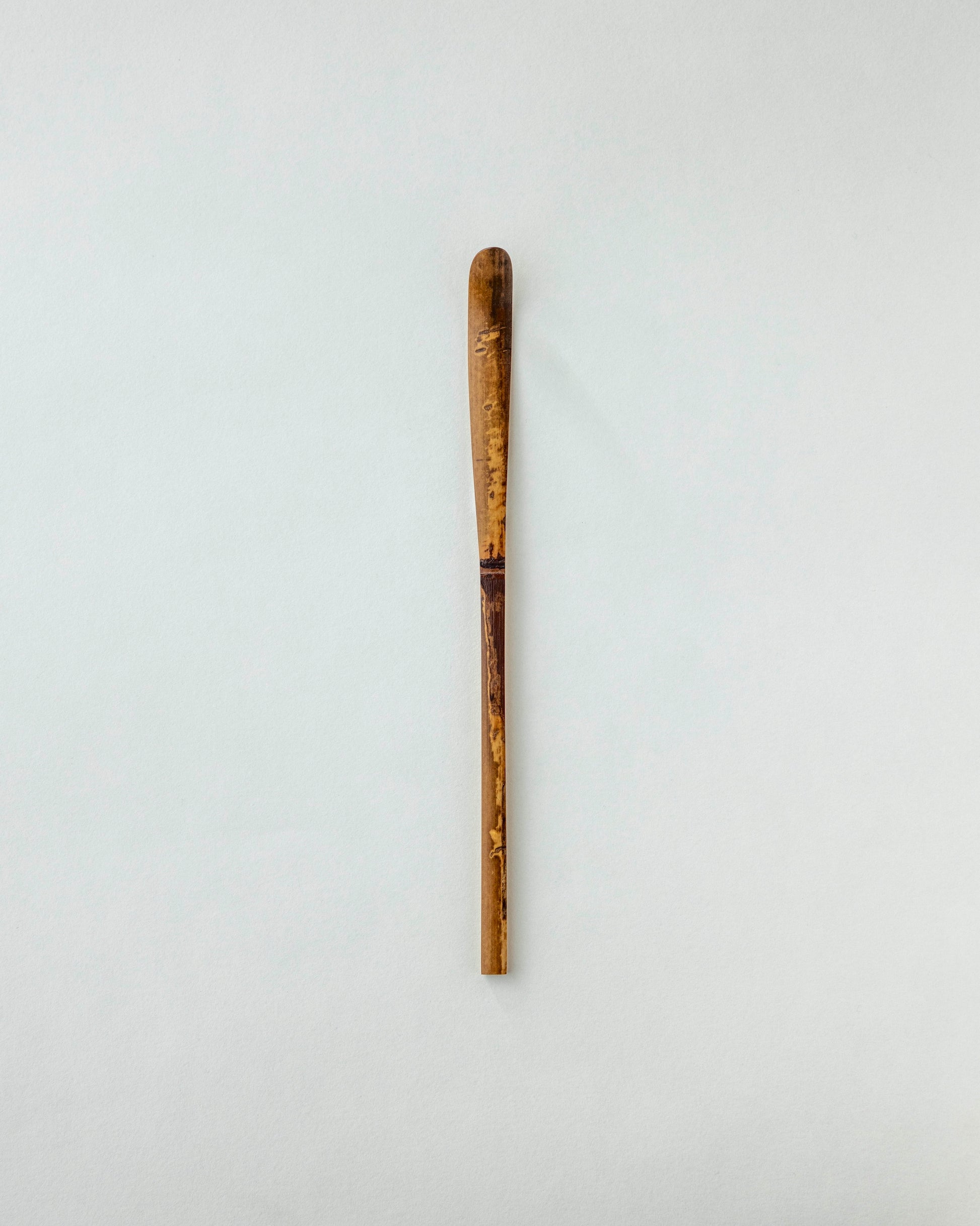 現在、良質な煤竹は希少傾向にあります。竹工芸家・初田徹は、そのような限りのある素材と丁寧に対話をしながら、吟味した竹をひとつひとつ削ります。煤竹が織りなす独特の色味と艶、美しく湾曲した櫂先、そして使用に差し支えない古い傷跡は見所として、用と美を兼ね備えた作品です。