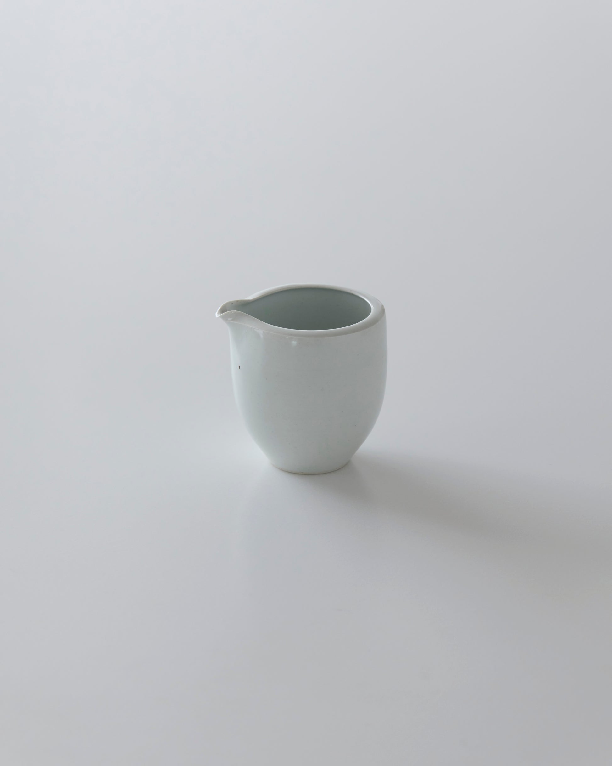 ふっくらとしたフォルムの片口は、手に収まるサイズ感です。酒器としてはもちろん、ソースや出汁をしのばせても、淡く青みを帯びた雪の白が所作をやさしく包みます。