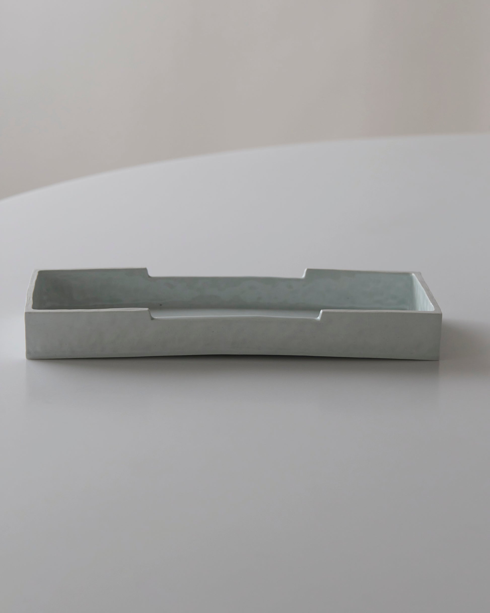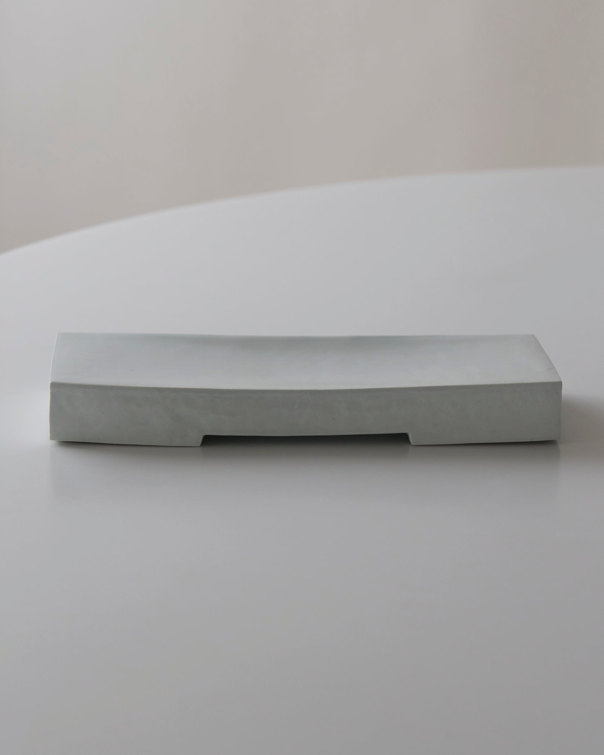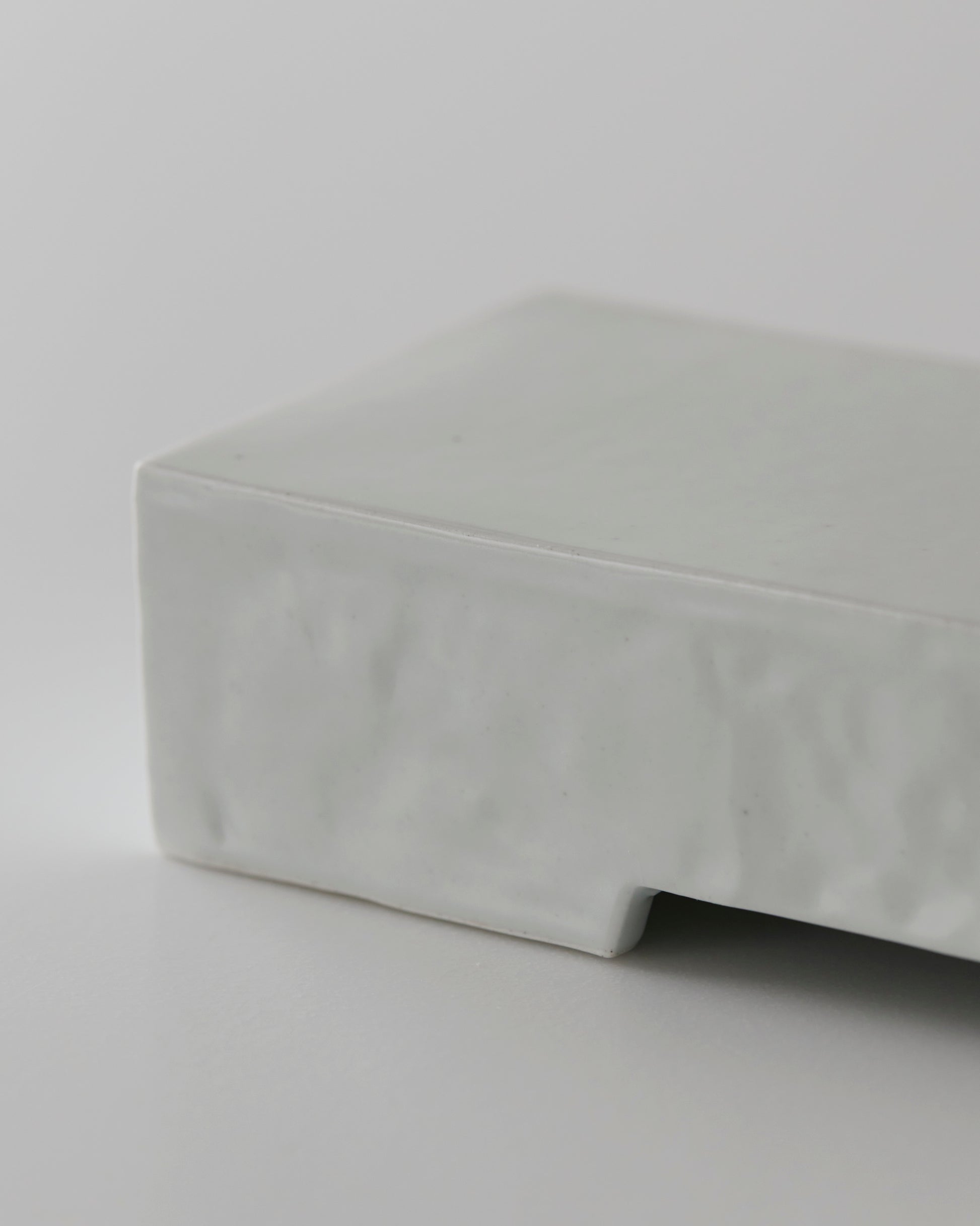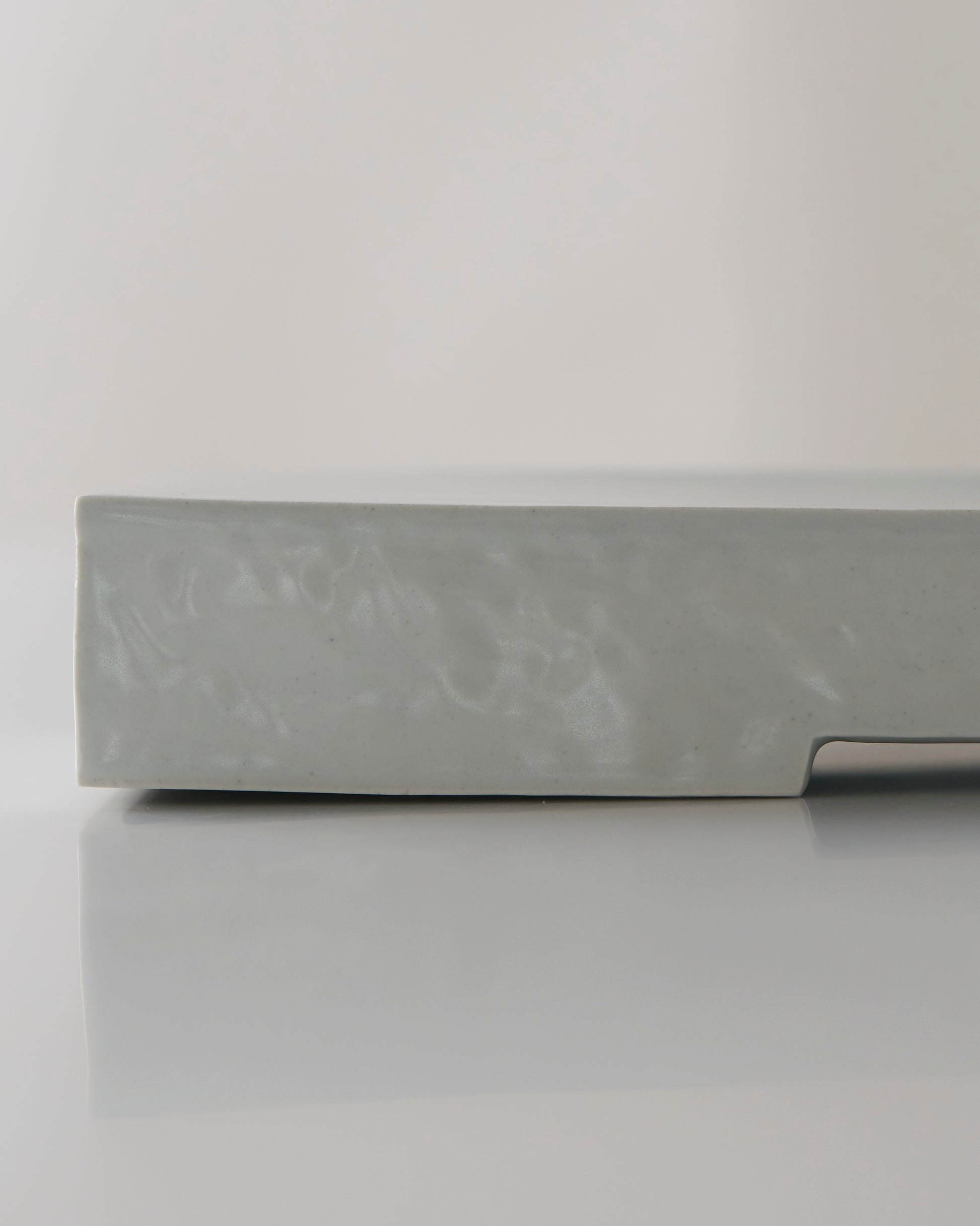 横に伸びる端正なかたちが、盛り付ける料理そのものを一幅の絵のように引き立てる高台の角皿。前菜や焼き物、菓子をのせるだけで、卓上に美しい景色が立ち上がります。