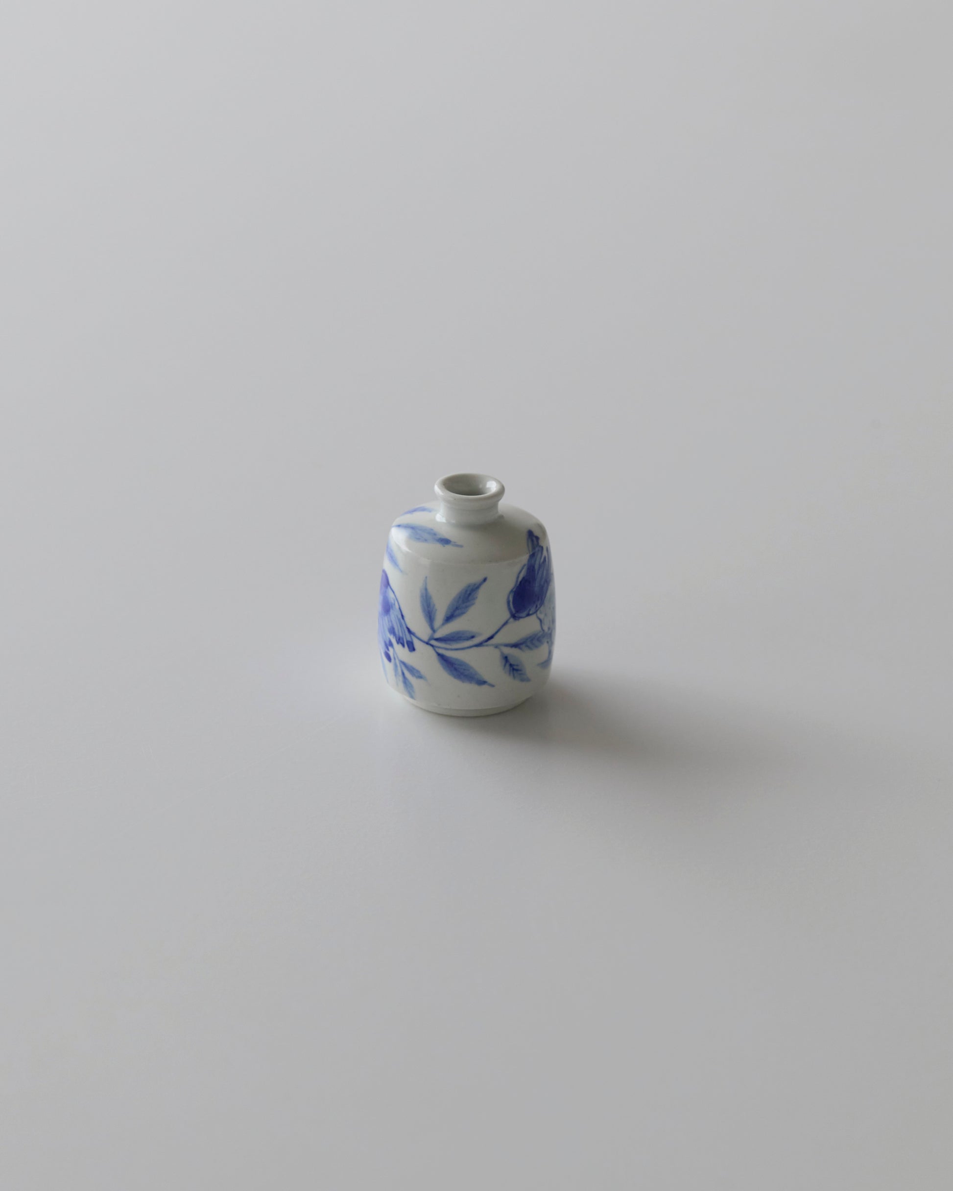 掌にすっと収まる小さな壺の表面に、青花の仏手柑が静かに描かれています。淡く青みを帯びた雪の白と、力強い青の絵付けが響き合い、小さな季節の景色を生み出します。